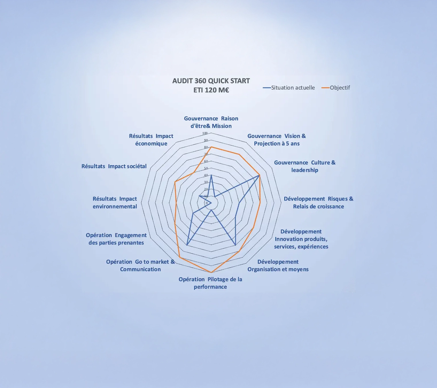 Sur l’exemple ci-contre, on mesure une performance économique (EBITDA) mauvaise avec 2 chantiers prioritaires à mettre en place sur l’OFFRE et le PILOTAGE DE LA PERFORMANCE.